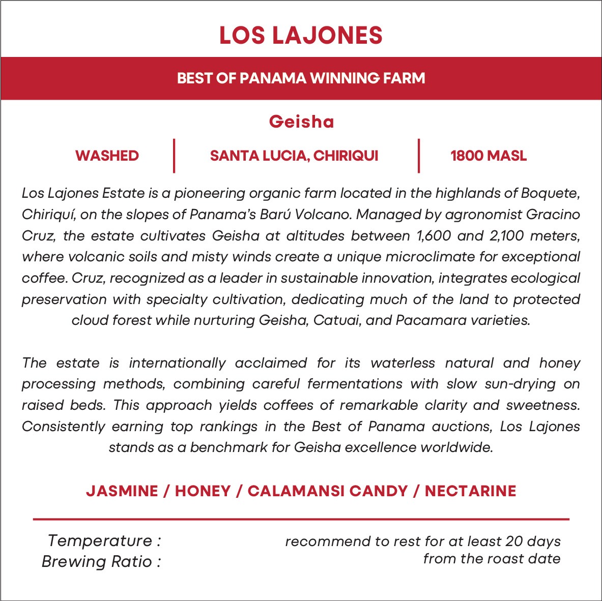 Tasting Note: Jasmine, Honey, Calamansi Candy, Nectarine